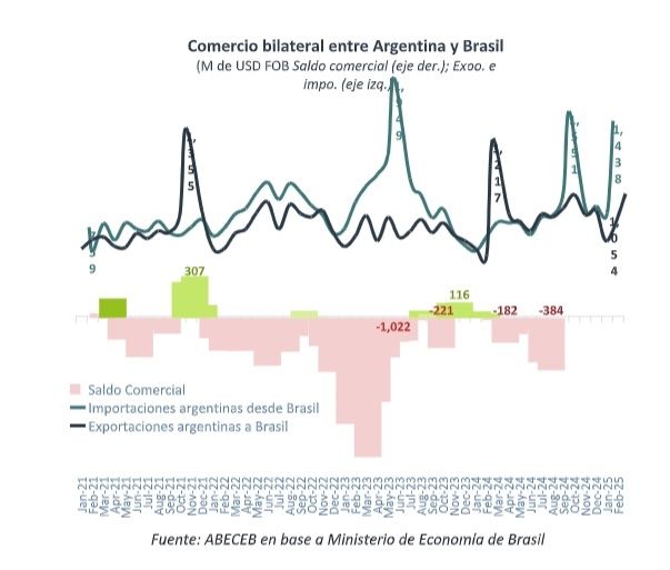 En febrero de 2025, Argentina mostró un déficit en su balanza comercial bilateral con Brasil de US$ 384 millones, según datos del ministerio de Economía de Brasil, relevados por la consultora ABECEB.