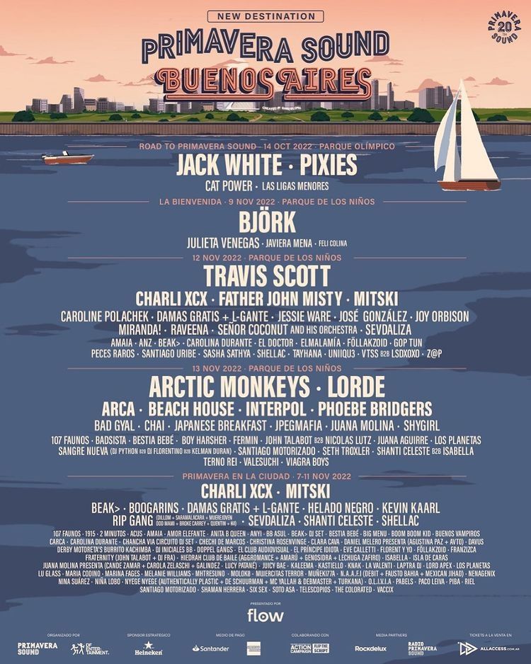 Entre los nombres más destacados se encuentran Arctic Monkeys, Björk, Travis Scott, Lorde, Charli XCX, Jack White, Pixies, Interpol, Cat Power, Beach House y Arca. Además, más de 150 artistas particparán de este debut del Primavera Sound en la ciudad de Buenos Aires.