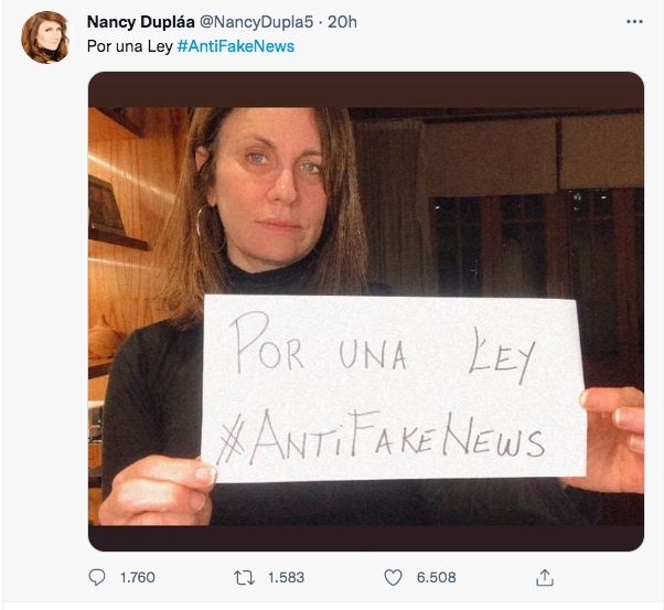 La actriz compartió una foto sosteniendo un cartel que dice: "Por una ley #antifakenews". Rápidamente, recibió fuertes críticas de miles de usuarios de la red social del pajarito.