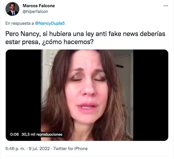 "Pero Nancy, si hubiera una ley anti fake news deberías estar presa, ¿cómo hacemos?", expresó el politólogo Marcos Falcone, sumando un video de la actriz convocando a una movilización en Plaza de Mayo denunciando la "desaparición forzada" de Santiago Maldonado.