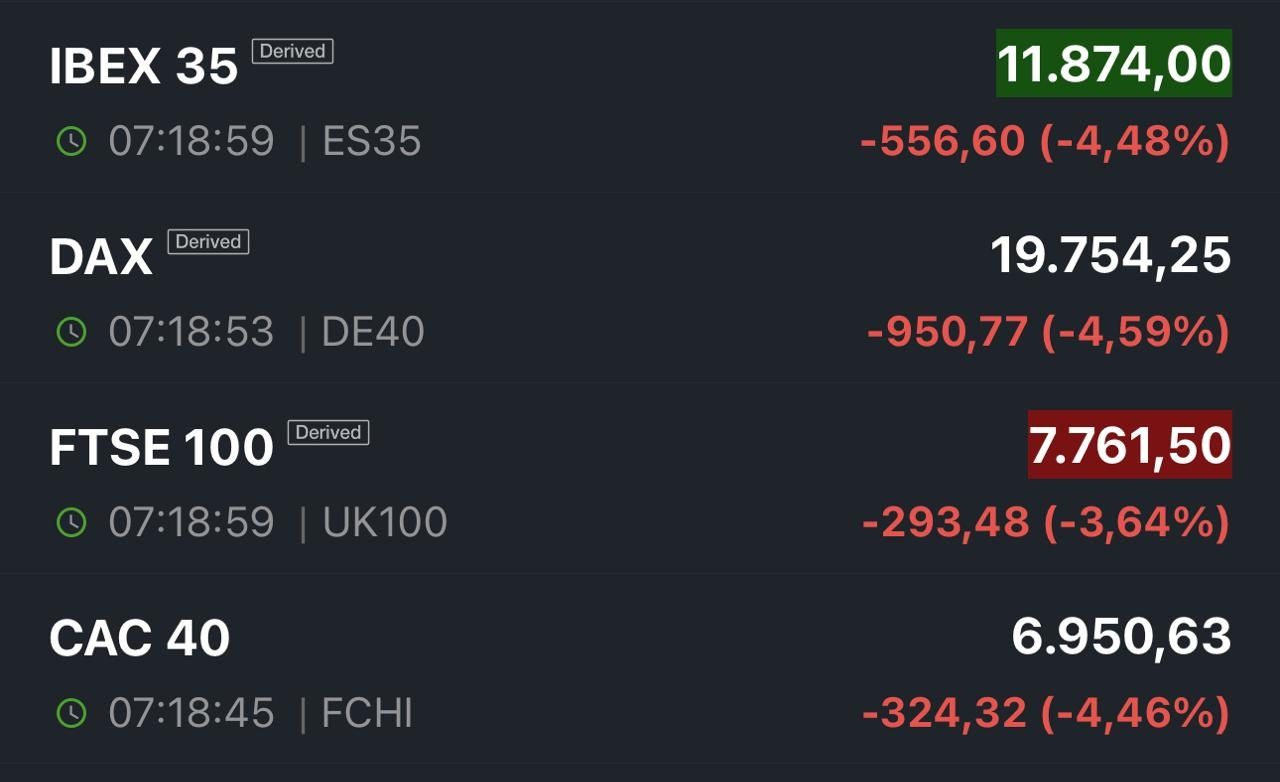 La bolsa de Madrid cae un 4,48%; mientras que Alemania abre sus operaciones en 4,49% negativos. Londres cae 3,50% y París llega al casi 5%.