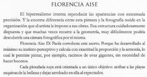 Es que los creativos protagonistas son, además de talentosas y creativas, dos personas muy queridas y con una frondosa troupe de amigos y conocidos. Florencia Aise y Carlos Escoriza sorprendieron con sus propuestas. Andrés Cáceres, el reconocido crítico de arte elaboró una reseña sobre cada uno de los expositores, que compartimos a continuación.