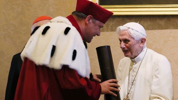 De hecho, el anuncio de su renuncia fue una carta en latín leída por él mismo durante un encuentro en el Vaticano el 11 de febrero de 2013.