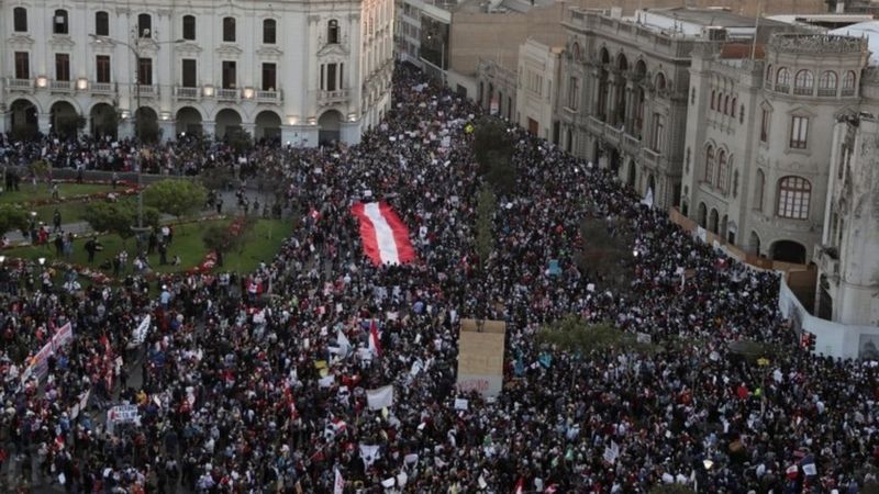 Decenas de miles de personas han salido a manifestarse a las calles de Lima y otras ciudades de Perú desde la noche del lunes para manifestar en contra destitución de Martín Vizcarra como presidente.