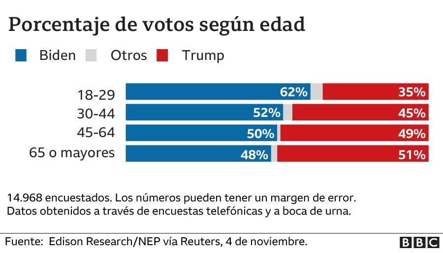 Los más jóvenes votaron por Biden. Entre los ciudadanos de menos de 30 años, el presidente electo consiguió el 62% de los votos.