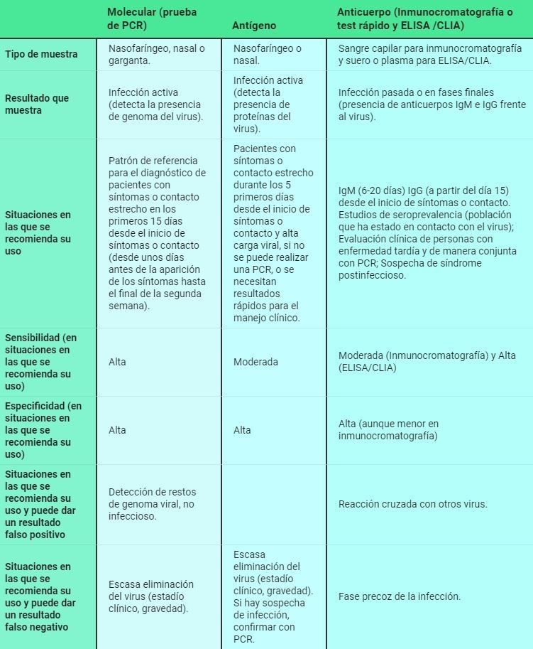 En la siguiente tabla se muestra un resumen de las situaciones clínicas donde se puede aplicar cada prueba y cuáles, dentro de las aplicaciones recomendadas, son aquellas situaciones donde hay más probabilidad de que se obtenga un falso positivo (un positivo en personas no infectadas) o un falso negativo (un negativo en personas que sí están infectadas).