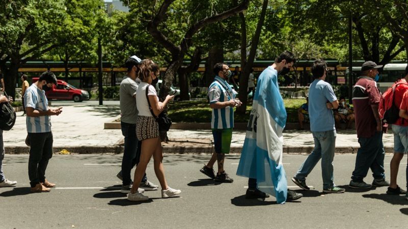 Pasadas las 13:00, la fila de personas que esperan ver el cuerpo de Maradona supera las 16 cuadras: casi dos kilómetros de distancia.