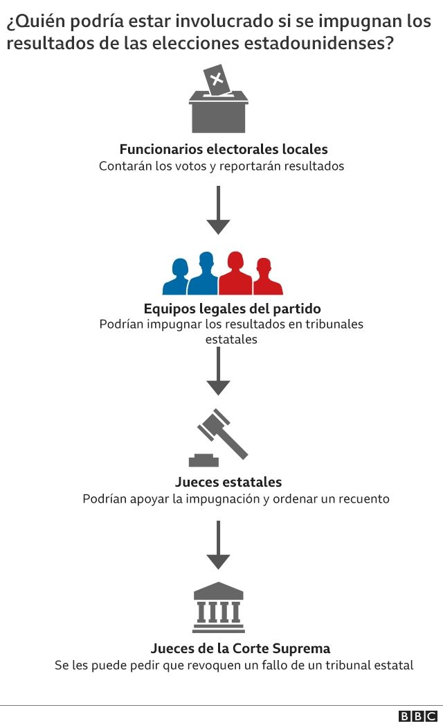 La BBC conversó con expertos legales sobre lo que puede significar esto y qué puede ocurrir si la resolución de la disputa se demora. ¿Es posible que las elecciones de EE.UU. se decidan en los tribunales?