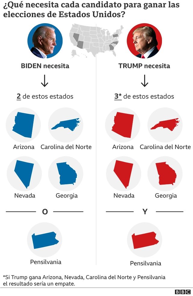 Para retener la Casa Blanca, no sólo debe ganar los estados donde tiene una muy ligera ventaja: Pensilvania y Carolina del Norte. Además, tiene que dar la vuelta en al menos dos de los estados antes mencionados donde Biden lleva la delantera: Nevada, Arizona o Georgia.