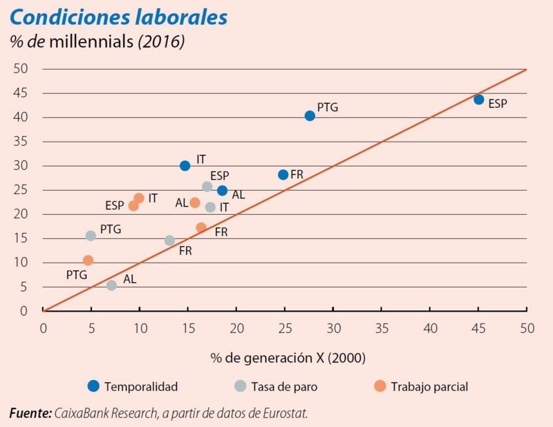 Y la vivienda, claro. El número de millennials con vivienda propia en EE.UU. es 8 puntos porcentuales menor, según el centro de investigación The Urban Institute. Peor en España: un 44% frente al 65% de la generación X (CaixaBank Research). Y en Reino Unido, un tercio de ellos nunca podrá permitirse una vivienda, según el think tank Resolution Foundation.