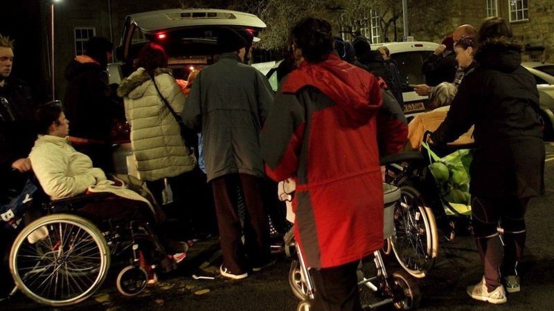 Hay una pareja en el aparcamiento que está pasando dificultades. Ella va en silla de ruedas y él es su cuidador. Dicen que tienen problemas para conseguir suficiente dinero y comida.