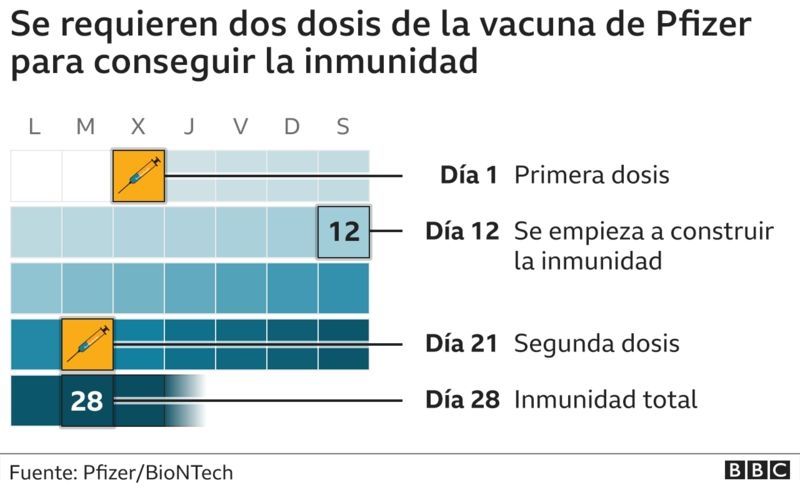 El compuesto de Pfizer y BioNTech se administra en dos dosis separadas por 21 días y la inmunidad total no se consigue hasta alrededor de una semana después de la segunda dosis, según explicó Jonathan Van-Tam, asesor médico del gobierno británico.