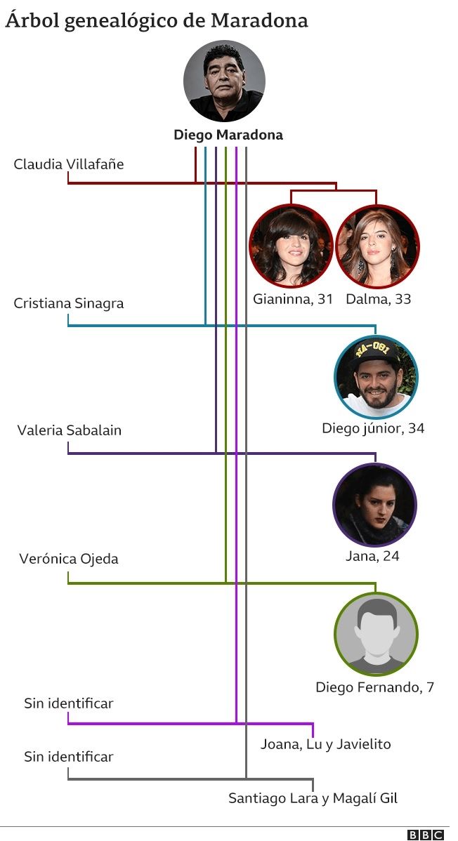 Durante años, Maradona negó otros herederos además de Gianinna, de 31 años, y Dalma, de 33, ambas hijas que tuvo con su ex esposa Claudia Villafañe, con quien se divorció en 2003 después de casi 20 años de matrimonio.