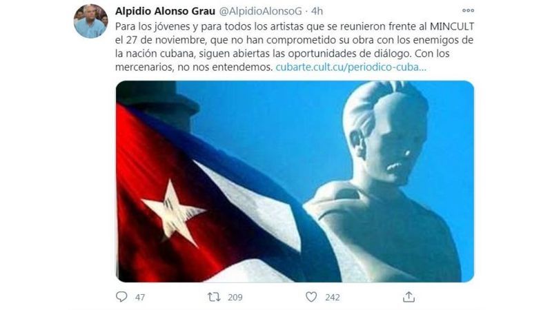 "Para los jóvenes y para todos aquellos artistas que se reunieron frente al MINCULT (Ministerio de Cultura) el 27 de noviembre, que no han comprometido su obra con los enemigos de la nación cubana, siguen abiertas las oportunidades de diálogo, como ha sido una práctica histórica de las instituciones culturales de la Revolución", indica la nota.