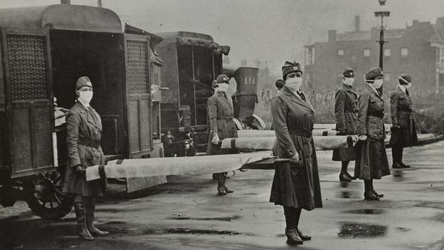 "Las teorías sobre el extraño comportamiento de la pandemia de la gripe de 1918 son que las personas de edades avanzadas podían haber tenido anticuerpos de brotes anteriores y que el hacinamiento masivo de soldados durante la Primera Guerra Mundial, especialmente en el transporte de tropas, fue un factor".