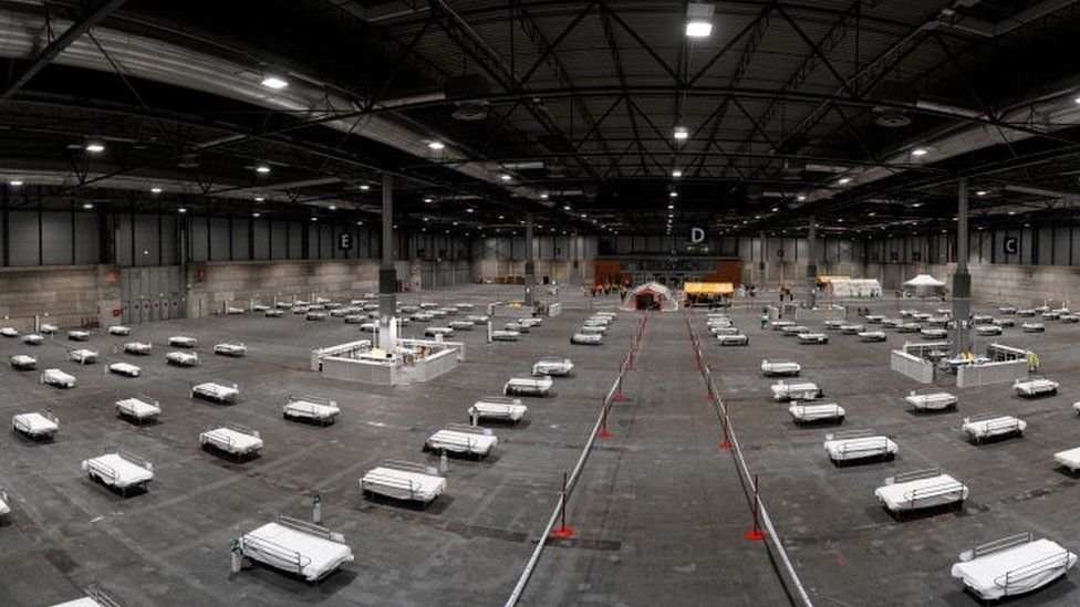 En Londres, el auditorio ExCel fue habilitado como hospital y se instalaron camas para 500 pacientes, capacidad que podría incrementarse eventualmente hasta 4.000.