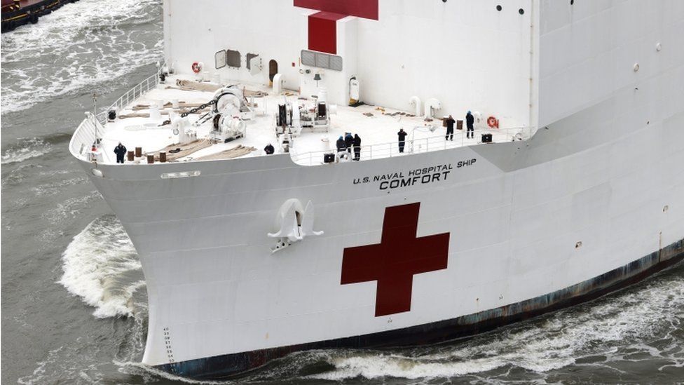 El buque hospital de la marina estadounidense Comfort atracó este lunes en la ciudad de Nueva York para ayudar con el brote del coronavirus.