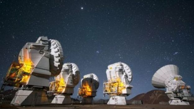El ALMA es un radiotelescopio compuesto por 66 antenas en la cima de una montaña en el desierto de Atacama, Chile, que observa el espacio a longitudes de onda milimétricas.