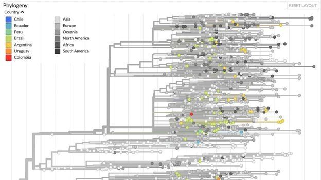 Si las mutaciones del virus en algún sitio del planeta tienen grandes similitudes con las de genomas obtenidos con anterioridad en otra parte del mundo, esas semejanzas pueden indicar tras un complejo análisis estadístico que el virus "viajó" de un país a otro.
