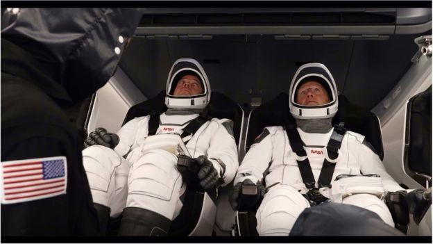 Los hombres están ascendiendo a la plataforma en órbita después de su lanzamiento en un cohete Falcon-9 desde el Centro Espacial Kennedy de Florida el sábado.