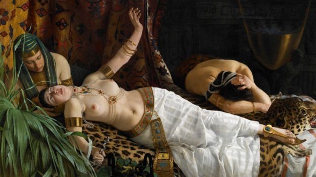 En lugar de caer bajo la dominación romana, Cleopatra, rodeada de suntuosas perlas, oro, plata e innumerables tesoros egipcios, se suicidó el 12 de agosto del 30 a.C., posiblemente por la mordedura de una cobra egipcia o áspid, un poderoso emblema de la divinidad faraónica.