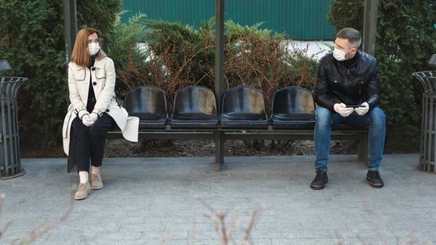 Con mascarilla, mirando para lados opuestos y sin respirar