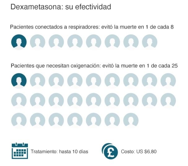 "El tratamiento es de hasta 10 días con dexametasona y cuesta alrededor de £5 (US$6,80) por paciente. Así que esencialmente cuesta £35 (US$44) salvar una vida", señaló.