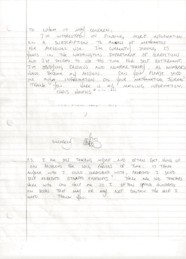 Fue después de completar el PTI que Havens envió su petición a la revista matemática, y mis padres se convirtieron en sus tutores. Le enviaban montones de libros, pero la prisión los bloqueaba todos debido a que no provenían de una editorial autorizada.