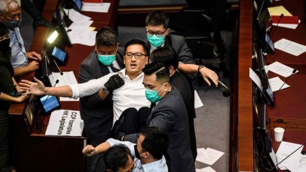 Sin embargo, el pasado lunes se dieron escenas caóticas en la cámara legislativa cuando un grupo de parlamentarios prodemocracia fueron arrastrados fuera en una pelea por una ley que ilegalizaría la falta de respeto al himno nacional.