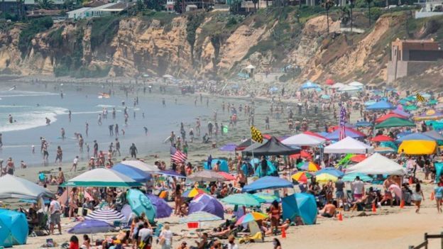 No hubo mucho distanciamiento social en las playas de California el 4 de julio de 2020, para marcar el Día de la Independencia.