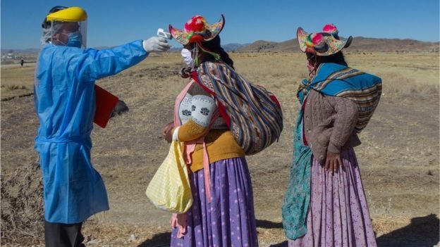 Un médico toma la temperatura a dos mujeres en un área rural de Perú.