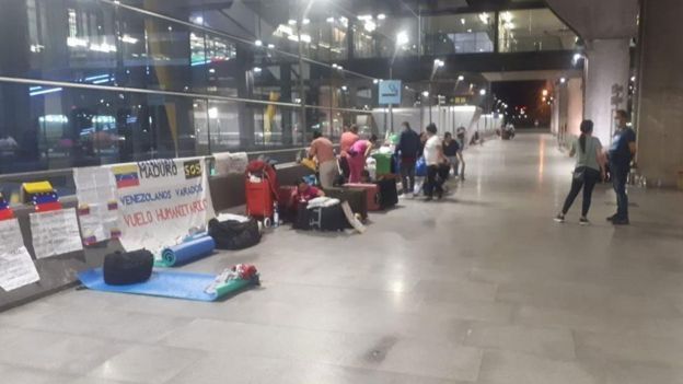 "Hay niños, personas mayores y enfermas. No están adentro sino al frente de la terminal 4 del aeropuerto, sentados en una acera a un lado de la calle, por donde pasan los carros y autobuses", dice a BBC Mundo.
