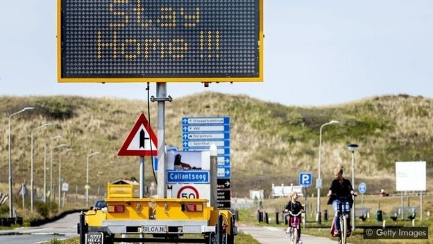 Una señal de tráfico, instalada en abril en el norte de Holanda, insta a los residentes neerlandeses a quedarse en casa.