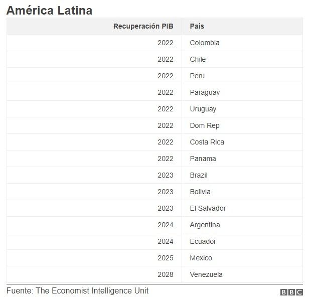 El centro de estudios The Economist Intelligence Unit (EIU), anticipa que los países que podrían recuperar su nivel de crecimiento previo a la pandemia hacia fines de 2022 son: Colombia, Chile, Perú, Paraguay, Uruguay, República Dominicana, Costa Rica y Panamá.