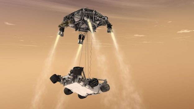 A continuación se activarán ocho retrocohetes, que permitirán realizar la maniobra "grúa celeste", por la que el Perseverance bajará lentamente con tres cuerdas de nylon y un "cordón umbilical".
