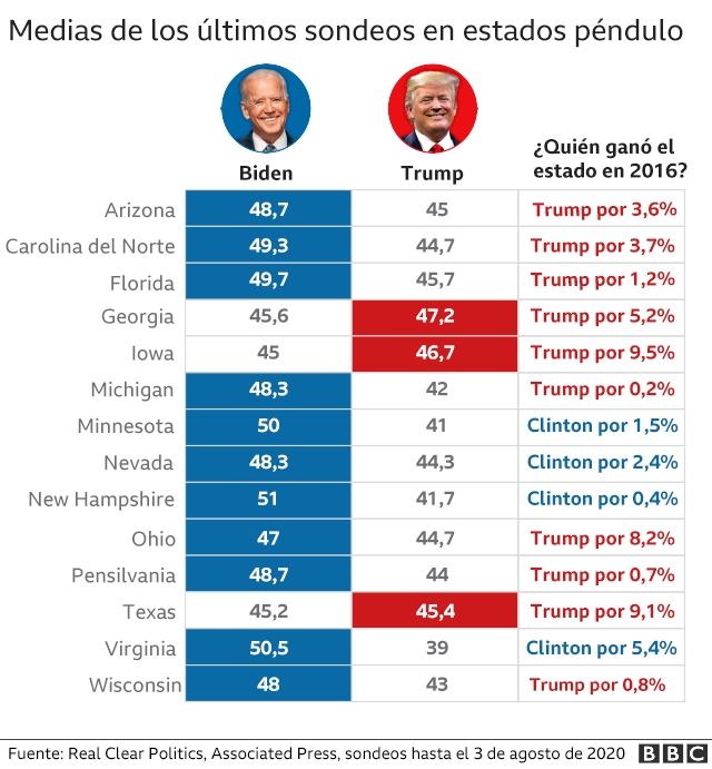 Pero son los estados péndulo en los que Trump ganó cómodamente en 2016 por los que su equipo de campaña estará más preocupado. Su margen de victoria en Iowa, Ohio y Texas fue de un 8-10% entonces, pero actualmente está a la par con Biden en los tres.