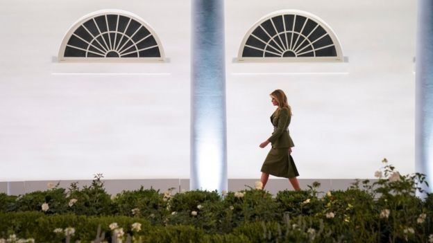 Durante su discurso en uno de los jardines de la Casa Blanca, con una audiencia sentada a poca distancia y sin mascarilla, la primera dama inició su discurso con un mensaje emotivo sobre el coronavirus y su impacto en EE.UU.