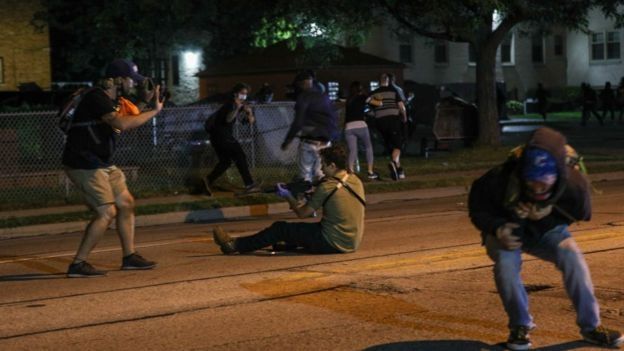 Más tarde, al joven se le ve siendo perseguido por un grupo, se escucha un disparo, Rittenhouse se vuelve en dirección del sonido y dispara cuatro veces contra la multitud aparentemente hiriendo a un hombre en la cabeza.