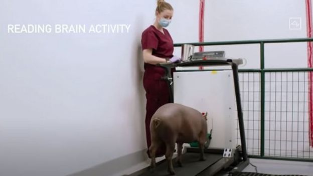 Se trata de un cerdo que ha tenido implantado un chip en su cerebro del tamaño de una moneda durante dos meses y que está conectado con una computadora.