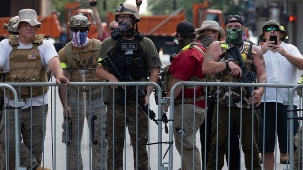 La presencia de milicias armadas con rifles de asalto y ropa de camuflaje ha sido notoria en protestas recientes contra las medidas de confinamiento por el coronavirus o contra el racismo y la brutalidad policial en EE.UU.