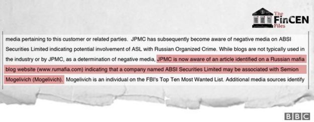 Sin embargo, un reporte de actividades sospechosas enviado por JP Morgan en 2015, después de que la cuenta implicada ya había sido cerrada, revela cómo su oficina de Londres pudo haber movido efectivo vinculado a Mogilevich.