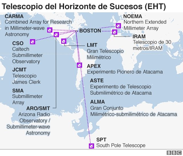 Este es un "observatorio virtual". Conecta una serie de ocho receptores de radio, desde el Polo Sur hasta Hawái, en América y Europa, para imitar la resolución que se obtendría con un solo telescopio del tamaño de la Tierra.