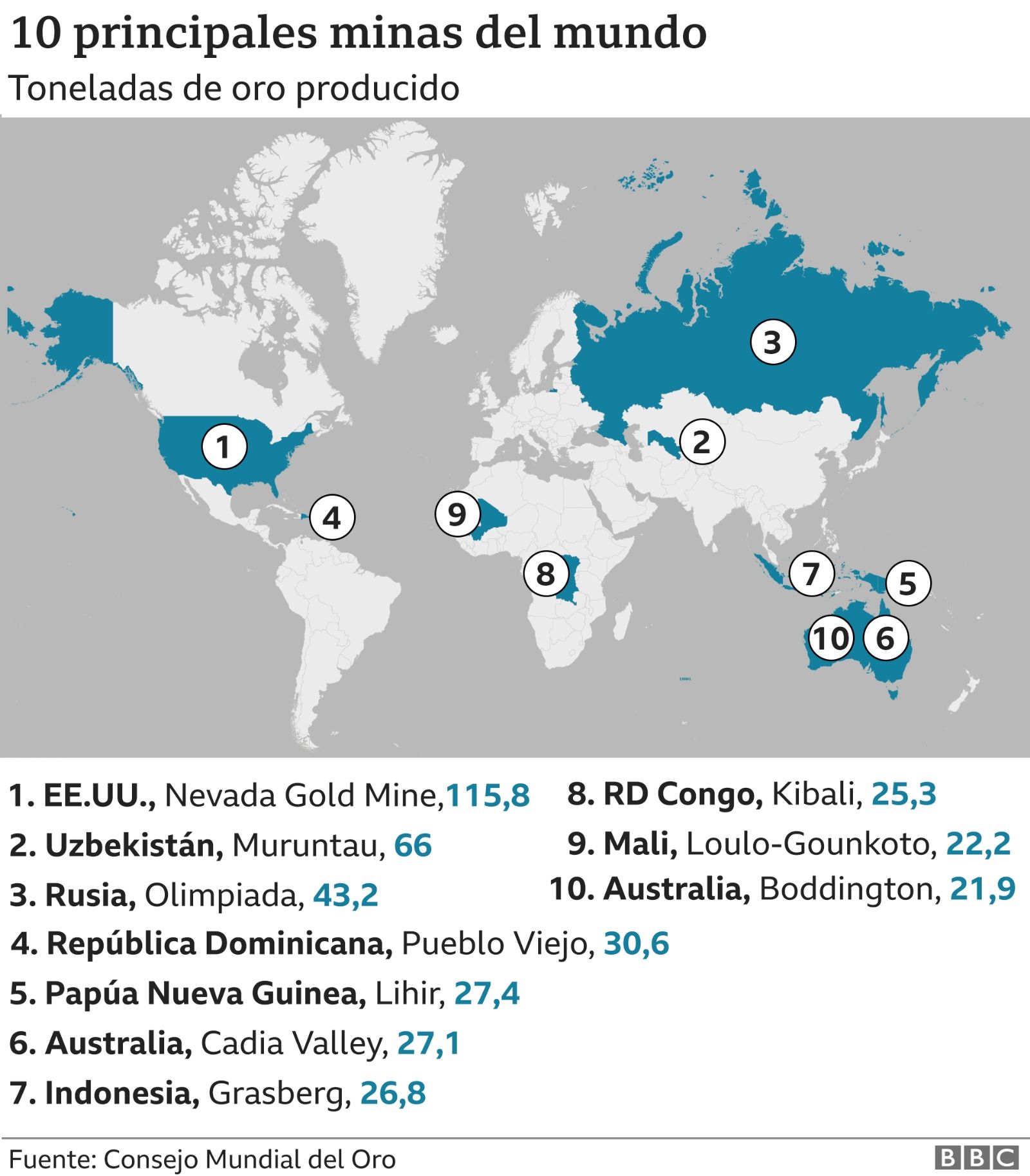 China es actualmente el país con mayor producción de oro del mundo, mientras que Canadá, Rusia y Perú también son importantes actores a nivel internacional.