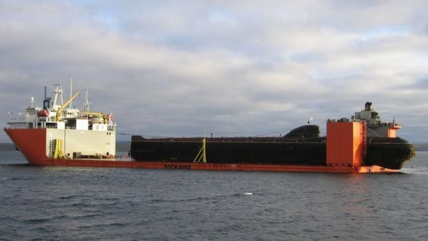 Una barcaza parcialmente sumergible se colocaría debajo, luego se llevaría a la superficie junto con el submarino y finalmente se remolcaría a puerto.