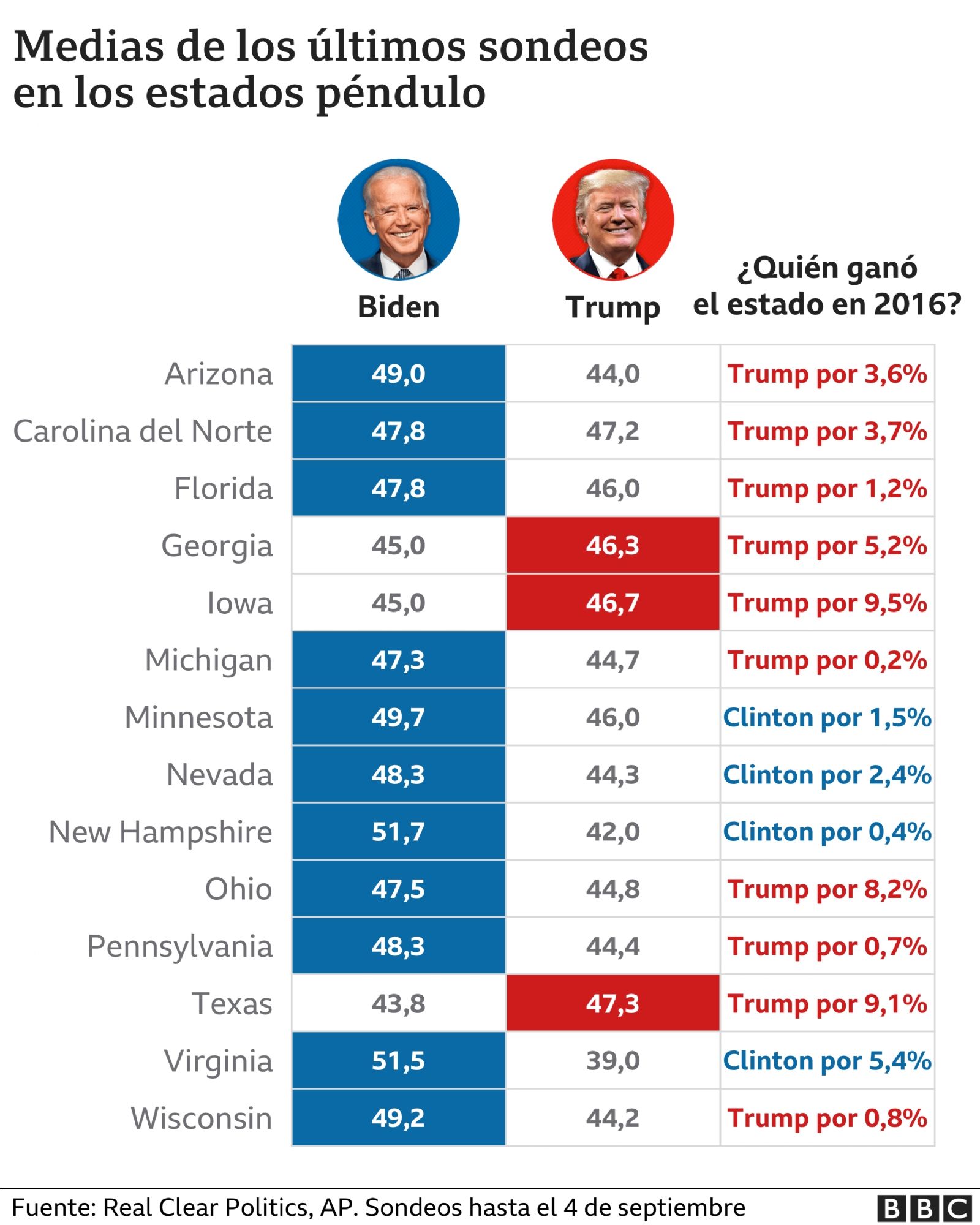 Pero son los estados péndulo en los que Trump ganó cómodamente en 2016 por los que su equipo de campaña estará más preocupado. Su margen de victoria en Iowa, Ohio y Texas fue de un 8-10% entonces, pero actualmente está a la par con Biden en los tres.
