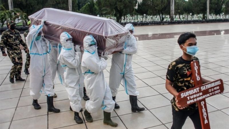 Los cementerios en Yakarta, el epicentro de la pandemia, están llenos y los hospitales dicen que están luchando por hacer frente a la cantidad de pacientes.