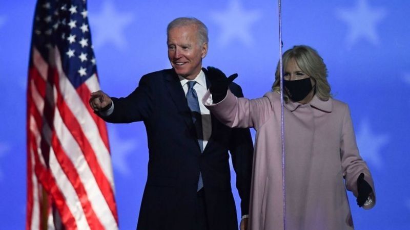 Al terminar su mensaje, el ahora presidente, Joe Biden, apareció en la escena, la abrazó y elogió sus cualidades como futura primera dama de EE.UU.