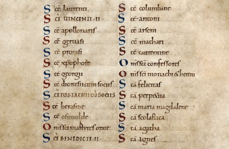 Una es una letanía de santos añadidos al final del libro, aproximadamente al mismo tiempo que se hizo el resto del libro, en el que los nombres de dos santos menores, Vincent y Eustaquio, aparecen en mayúsculas.