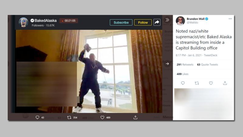 Uno de sus miembros, Nick Ochs, tuiteó un selfie dentro del Capitolio diciendo: "Hola desde la capital, jajaja". También filmó una transmisión en vivo desde el interior del Congreso. (La persona que está a la izquierda en la imagen no ha sido identificada).