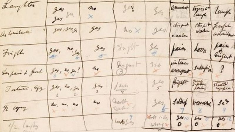 Pero también hizo experimentos en casa. Durante una serie de cenas de marzo a noviembre de 1868, le pidió a sus invitados que interpretaran las expresiones de un sujeto que aparecía en 11 fotografías tomadas por el anatomista francés Guillaume-Benjamin Duchenne, para examinar el movimiento de los músculos faciales.